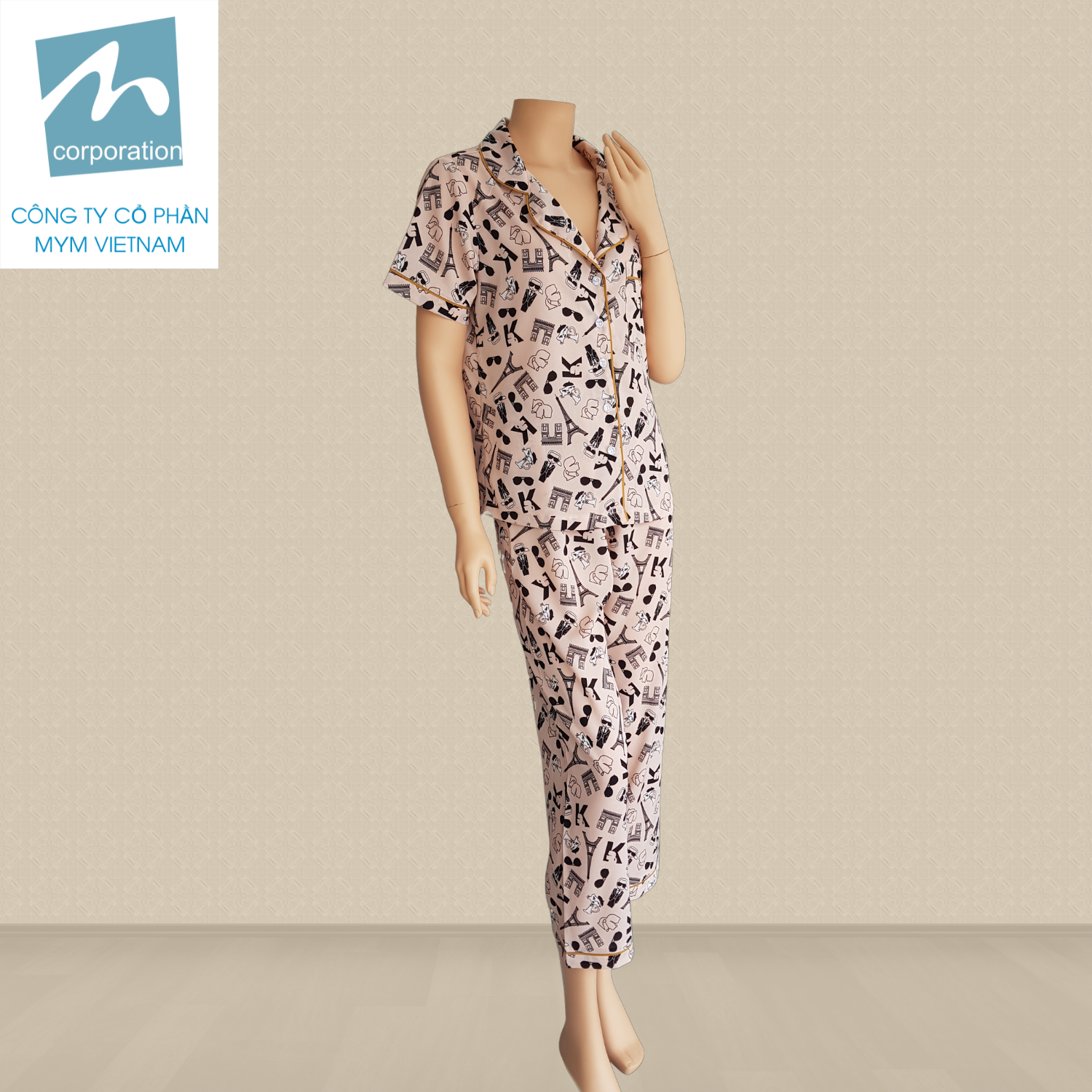 Thiết kế: Áo thiết kế cổ 2 ve khoét chữ K, tay áo ngắn, 1 túi vuông trước ngực. Cài khuy phía trước. Viền vải khác màu làm điểm nhấn. Quần dài ngang mắt cá chân. Cạp chun co giãn. Bộ Pijama nữ có form không bó sát vào cơ thể, giúp người mặc dễ dàng vận động cũng như có được giấc ngủ ngon hơn.