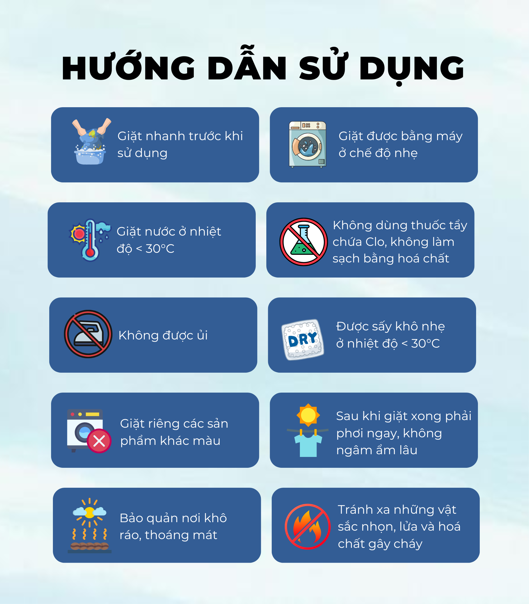 • Giặt riêng các sản phẩm khác màu. Sau khi giặt xong phải phơi ngay, không ngâm ẩm lâu